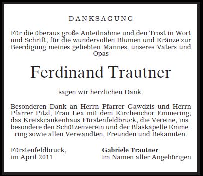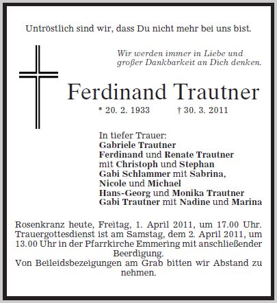 Gottesdienst mit anschließender Beerdigung am Samstag, dem 2. April 2011, um 13:00 Uhr in Emmering