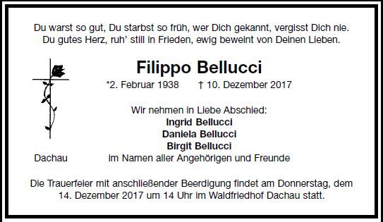 Die Trauerfeier mit anschließender Beerdigung ist am Donnerstag, dem 14. Dezember 2017, um 14 Uhr im Dachauer Waldfriedhof. |