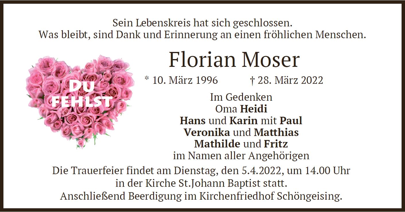 Wir trauern um Herrn Florian Moser * 10.03.1996 † 28.03.2022 |