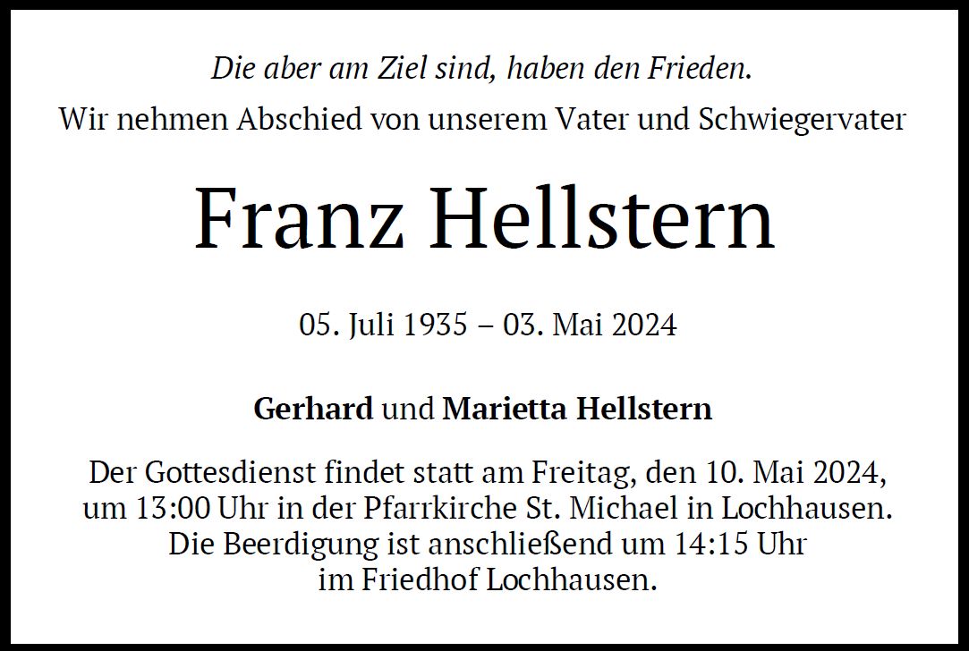 Wir trauern um Herrn Franz Hellstern * 05.07.1935 † 03.05.2024 |
