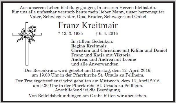 in der Pfarrkirche St. Ursula zu Pellheim. Anschließend ist die Beerdigung.