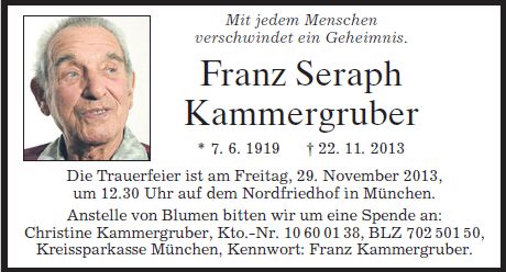 Die Trauerfeier ist am Freitag, dem 29. November 2013, um 12:30 Uhr auf dem Nordfriedhof in München Die Urnenbeisetzung findet zu einem späteren Zeitpunkt im engeren Familienkreis auf dem Nordfriedhof in München statt.