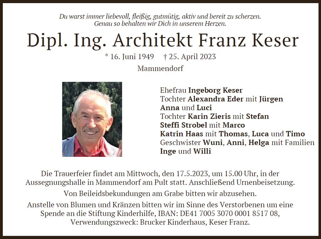 Wir trauern um Herrn Franz Keser Architekt * 16.06.1949 † 25.04.2023 |