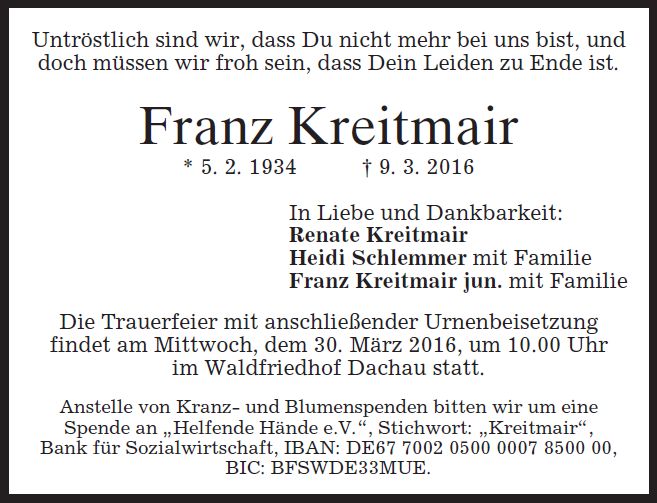 Wir trauern um Herrn Franz Kreitmair Schlosser * 05.02.1934 † 09.03.2016 |