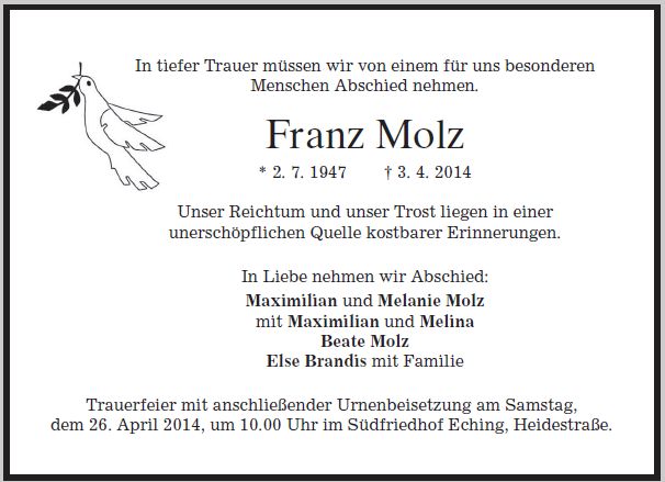Wir trauern um Herrn Franz Molz Technischer Angestellter * 02.07.1947 † 03.04.2014 |