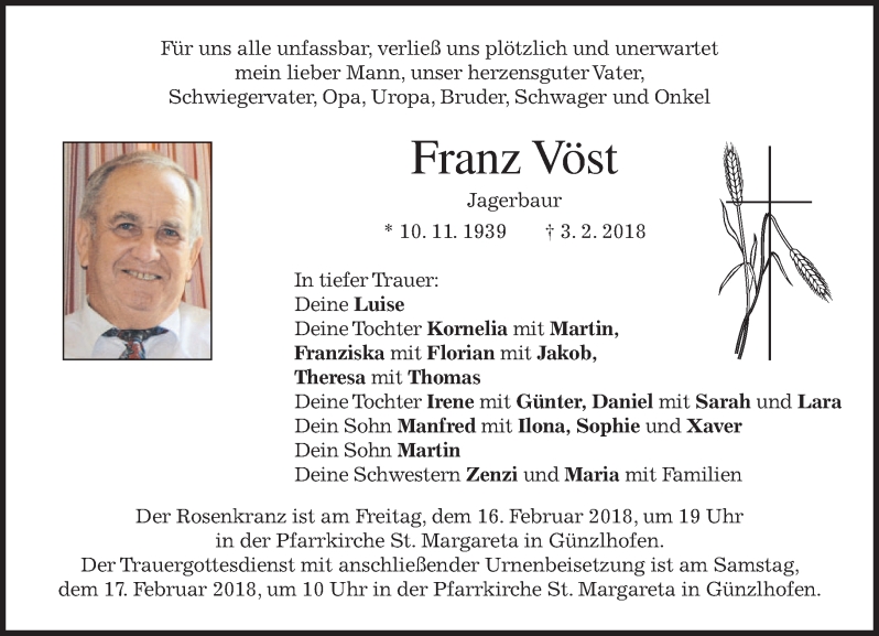 Wir trauern um Herrn Franz Vöst geb. Jagerbaur Landwirt * 10.11.1939 † 03.02.2018 |