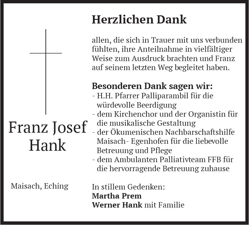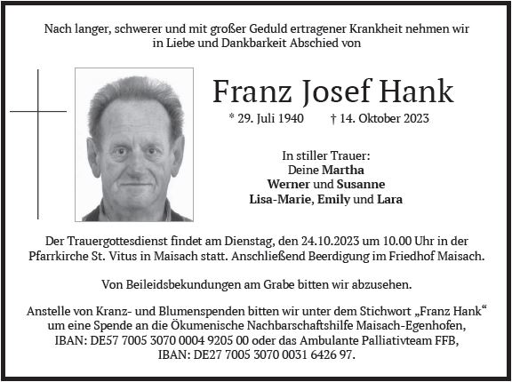 Von Beileidsbekundungen am Grabe bitten wir abzusehen. Anstelle von Kranz- und Blumenspenden bitten wir unter dem Stichwort Franz Hank