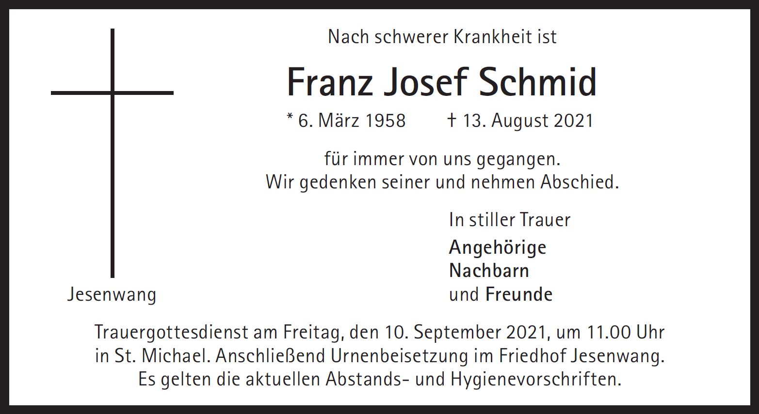 Trauergottesdienst am Freitag, den 10. September 2021 um 11:00 Uhr in St.Michael. Anschließend Urnenbeisetzung im Friedhof Jesenwang. Es gelten die aktuellen Abstands- und Hygienevorschriften.