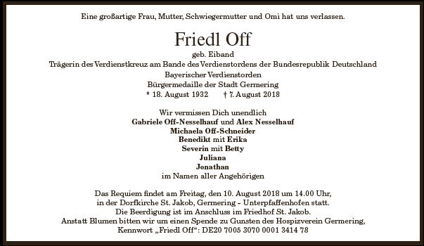 Wir trauern um Frau Fridolina Off geb. Eiband * 18.08.1932 † 07.08.2018 |