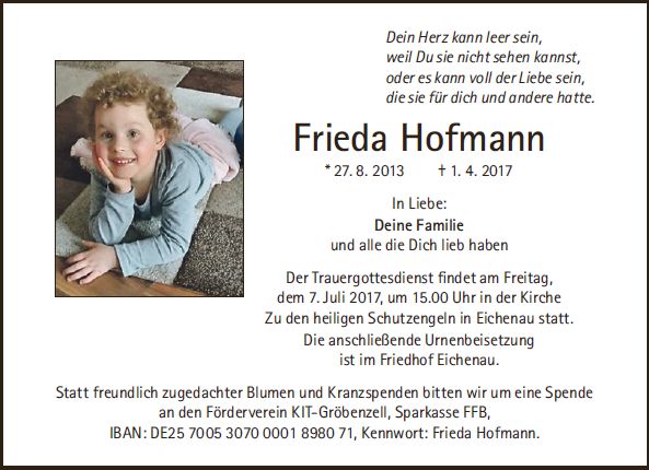 Wir trauern um Frieda Hofmann * 27.08.2013 † 01.04.2017 |