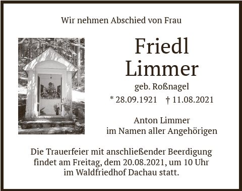 Die Trauerfeier mit anschließender Beerdigung ist am Freitag, dem 20. August 2021, um 10 Uhr im Dachauer Waldfriedhof. |
