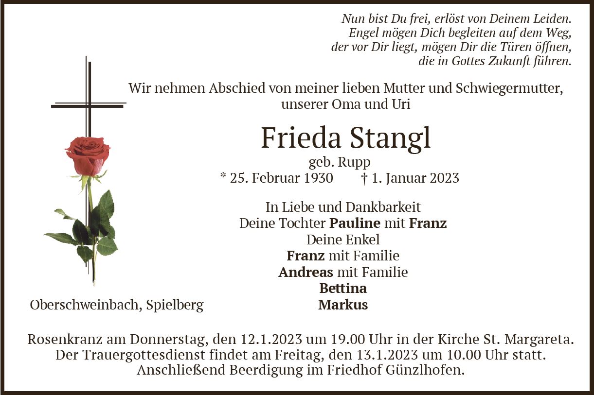 Wir trauern um Frau Frieda Stangl geb. Rupp * 25.02.1930 † 01.01.2023 |