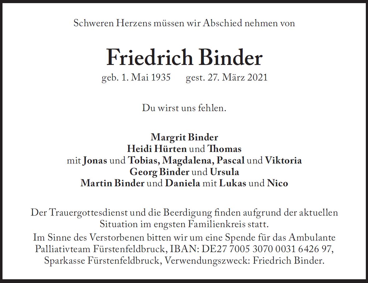 Wir trauern um Herrn Friedrich Binder Vermessungsingenieur * 01.05.1935 † 27.03.2021 |