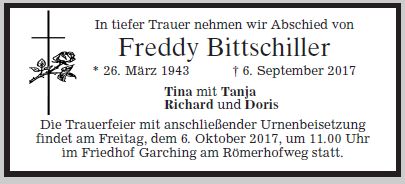 Trauerfeier mit anschließender Urnenbeisetzung am Freitag, dem 6. Oktober 2017, um 11:00 Uhr im Friedhof Garching am Römerhofweg |