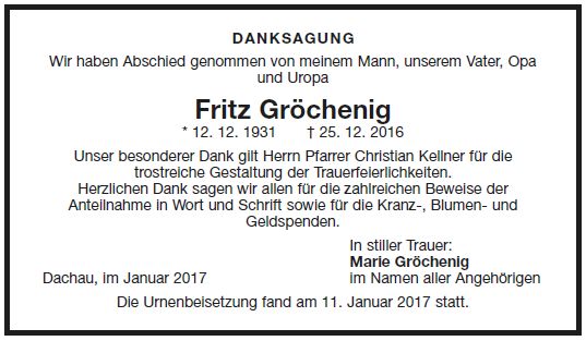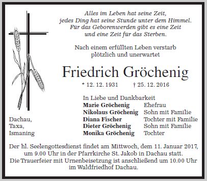 Der Trauergottesdienst ist am Mittwoch, dem 11. Januar 2017, um 9 Uhr in der Pfarrkirche St. Jakob, Dachau. Die Trauerfeier mit anschließender Urnenbeisetzung ist anschließend um 10 Uhr im Waldfriedhof Dachau. |