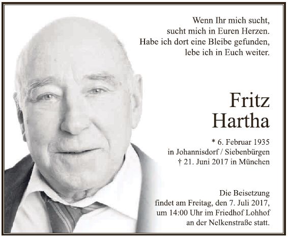 Wir trauern um Herrn Friedrich Hartha Schreiner * 06.02.1935 † 21.06.2017 |