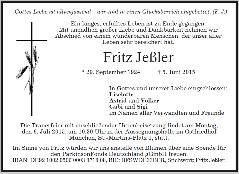 Trauerfeier am Montag, dem 6. Juli 2015, um 10:30 Uhr in der Aussegnungshalle im Münchner Ostfriedhof, St.-Martins-Platz 1 Urnenbeisetzung im Anschluss