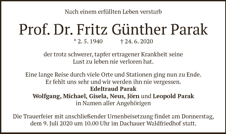 Die Trauerfeier mit anschließender Urnenbeisetzung findet am 09.07.2020 um 10:00 Uhr im Dachauer Waldfriedhof statt.