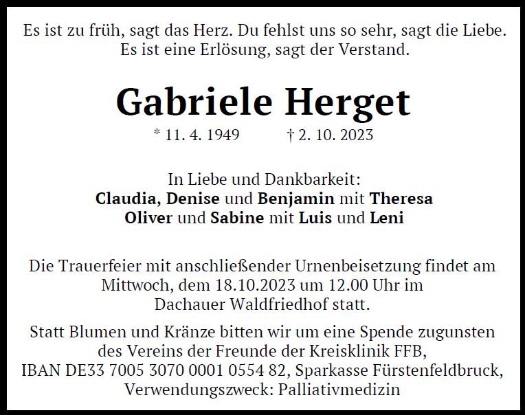 Trauerfeier mit anschließender Urnenbeisetzung am Mittwoch, dem 18. Oktober 2023, um 12:00 Uhr im Dachauer Waldfriedhof.