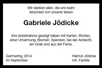 Wir trauern um Frau Gabriele Jödicke geb. Öttl Bankangestellte * 09.06.1939 † 20.08.2014 |