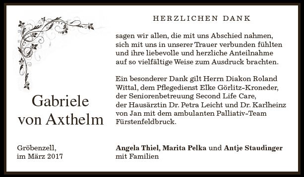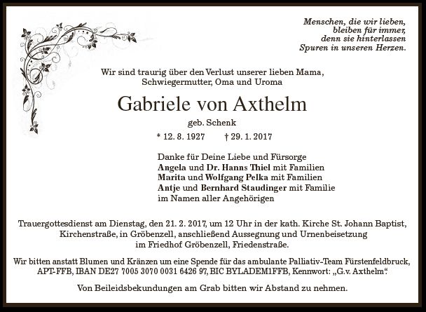 Der Gottesdienst ist am Dienstag, den 21. Februar 2017 um 12 Uhr, in der Pfarrkirche Johann Baptist, Gröbenzell. Die Trauerfeier mit Urnenbeisetzung findet im Anschluß im Friedhof Gröbenzell statt.