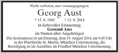 Der Gottesdienst ist am Dienstag, dem 19. August 2014, um 09:45 Uhr in der Kirche, St. Martin Die Beerdigung ist am Dienstag, dem 19. August 2014, um 10:30 Uhr im Friedhof München, Untermenzing