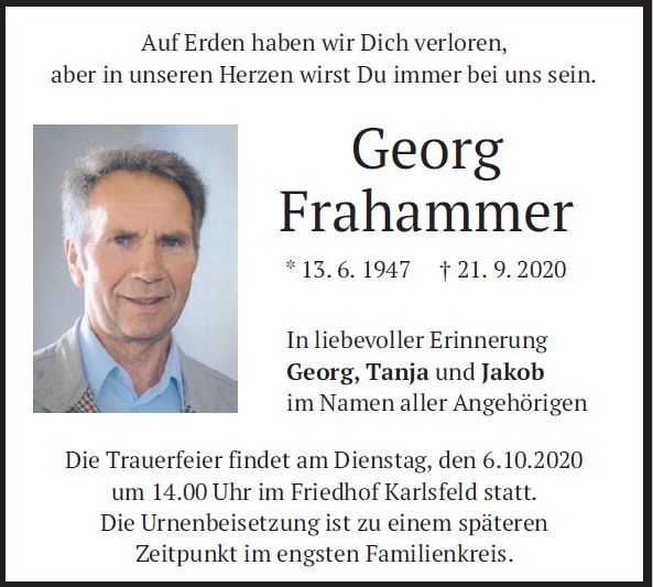 Wir trauern um Herrn Georg Frahammer * 13.06.1947 † 21.09.2020 |