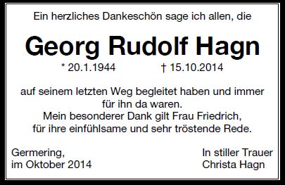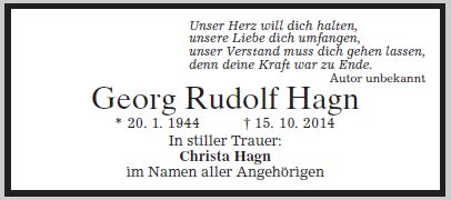 Wir trauern um Herrn Georg Hagn Diplom Wirtschaftsingenieur * 20.01.1944 † 15.10.2014 |