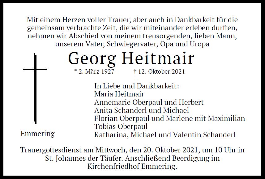 Wir trauern um Herrn Georg Heitmair * 02.03.1927 † 12.10.2021 |
