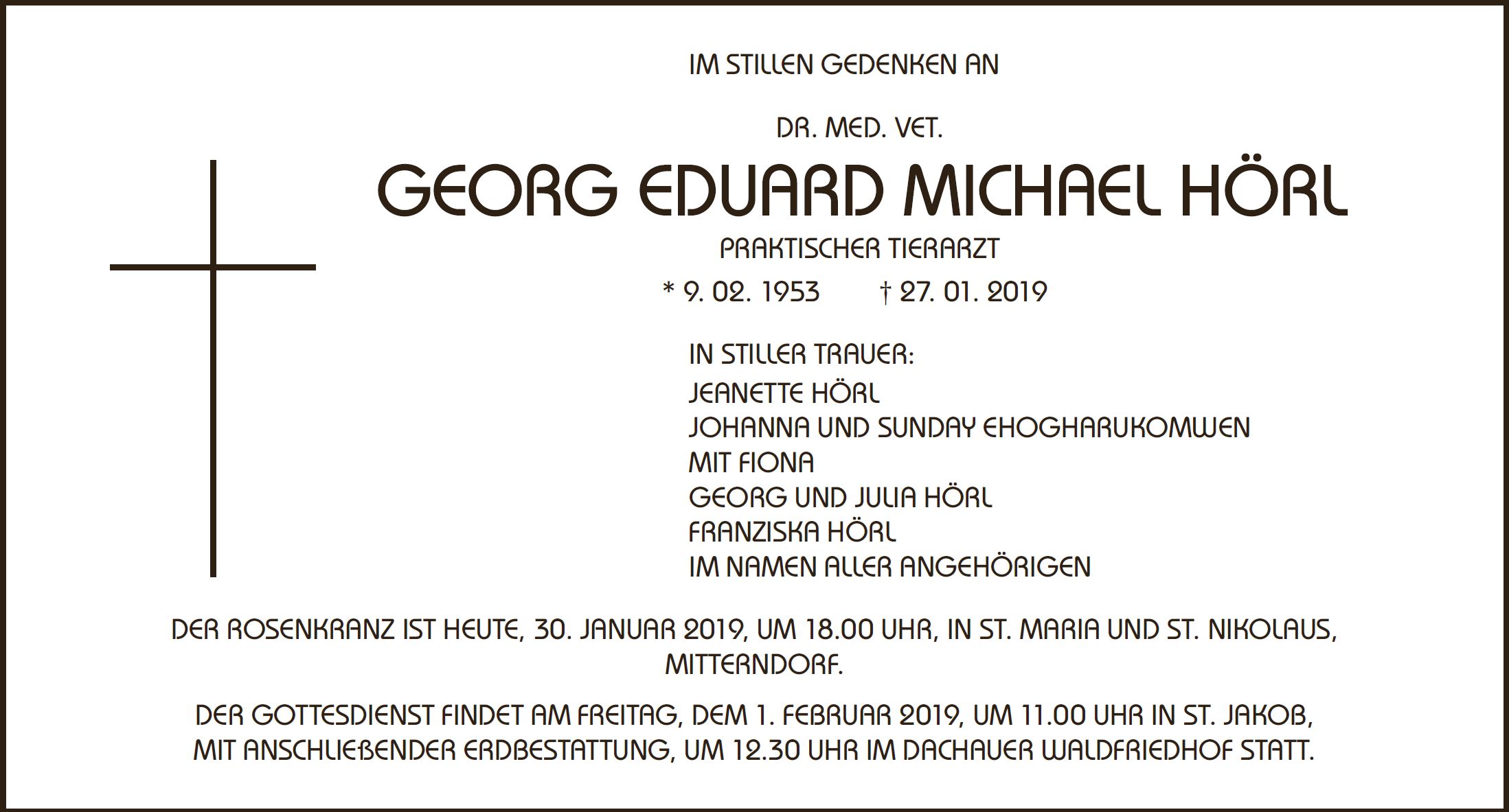 Wir trauern um Herrn Dr. med.vet. Georg Hörl * 09.02.1953 † 27.01.2019 |