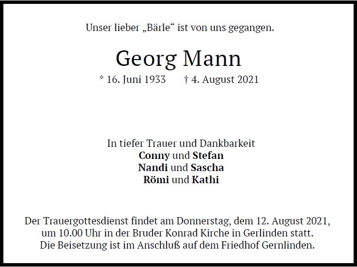 Gottesdienst am Donnerstag, dem 12. August 2021 um 10:00 Uhr in der Kirche Bruder Konrad. Anschließend Beerdigung im Friedhof Gernlinden.