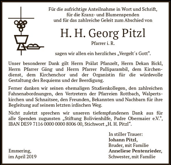 Requiem am Dienstag, 9.4.2019 um 11 Uhr in St. Johannes der Täufer, Emmering Beerdigung im Anschluss im kirchlichen Friedhof in Emmering.