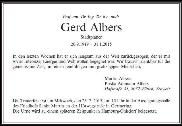 Wir trauern um Herrn Prof. Dr. Dr. hc mult Gerd Albers Stadtplaner * 20.09.1919 † 31.01.2015 |