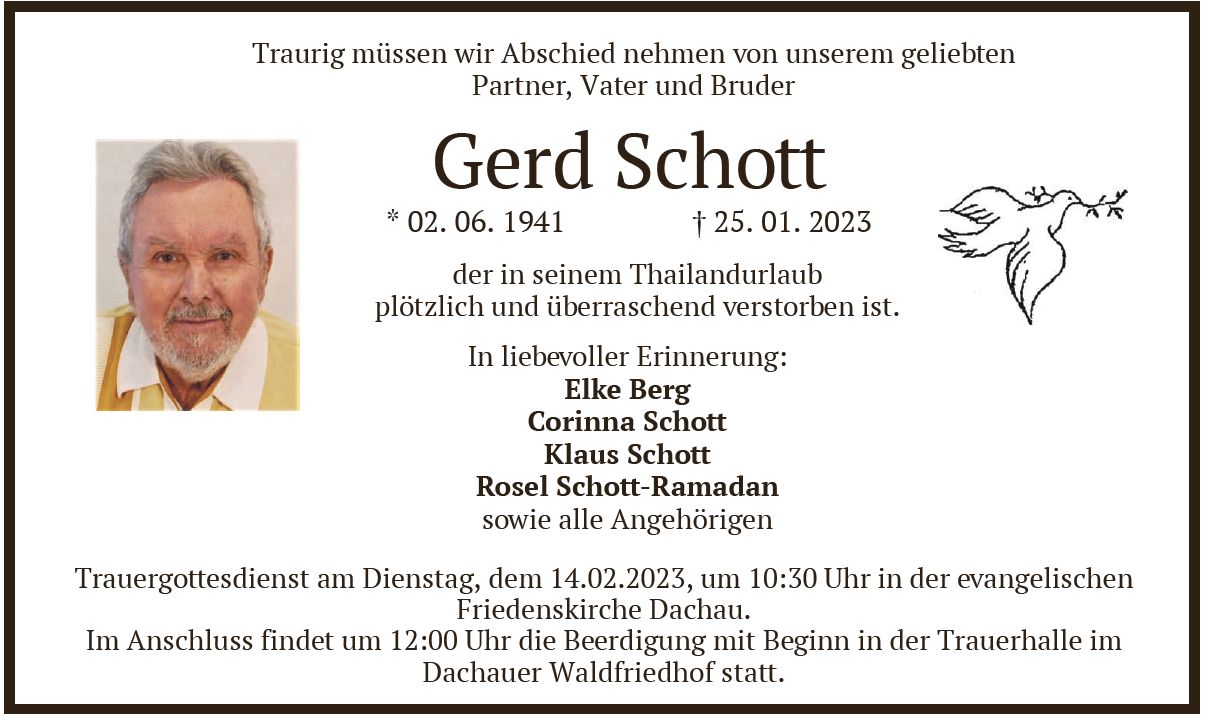 Trauergottesdienst am Dienstag, dem 14.02.2023 um 10:30 Uhr in der evangelischen Friedenskirche Dachau. Anschließend findet die Beerdigung um 12:00 Uhr im Dachauer Waldfriedhof statt.