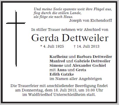 Trauerfeier mit anschließender Beerdigung am Donnerstag, dem 18. Juli 2013, um 10:00 Uhr im Waldfriedhof Unterschleißheim |