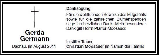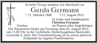 Trauerfeier am Dienstag, dem 23. August 2011, um 11:00 Uhr, Lichthalle, Hanrieder Bestattungshaus, Loestrasse 5, Dachau. |