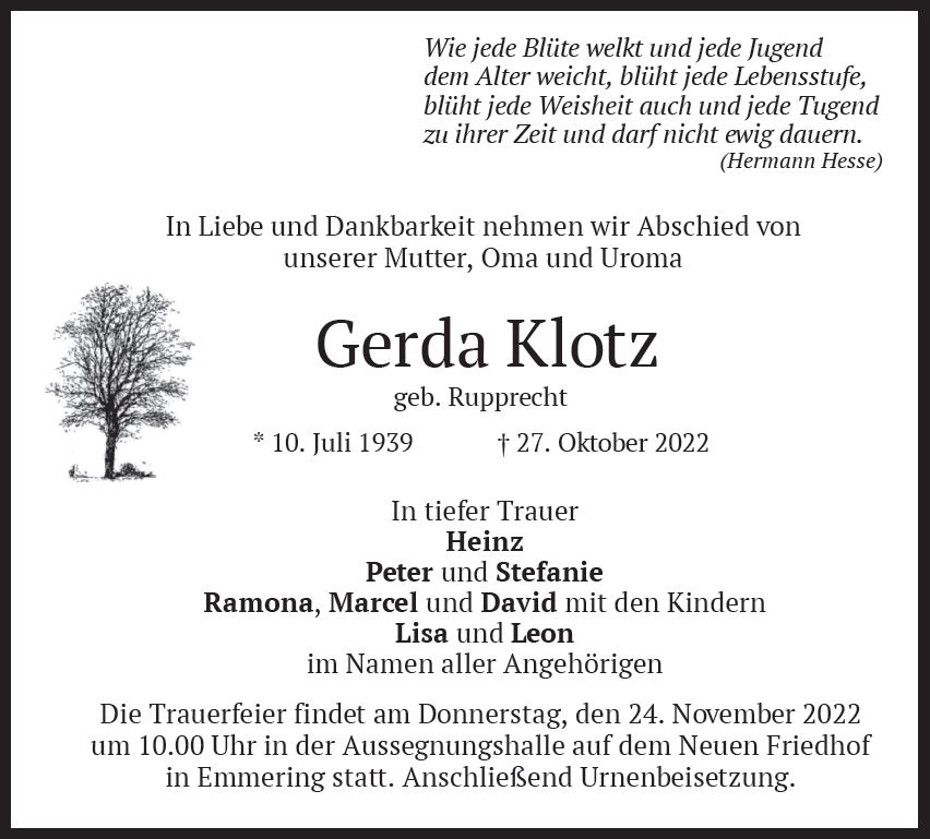Wir trauern um Frau Gerda Klotz geb. Rupprecht * 10.07.1939 † 27.10.2022 |