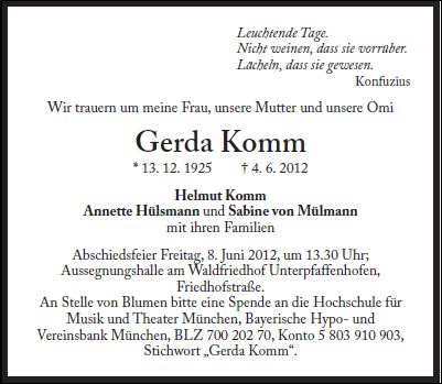 Wir trauern um Frau Gerda Komm geb. Apel Lehrerin * 13.12.1925 † 04.06.2012 |