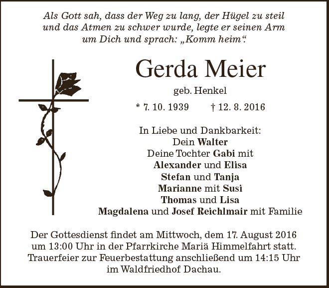 Gottesdienst am Mittwoch, dem 17. August 2016, um 13:00 Uhr in Mariä Himmelfahrt Trauerfeier anschließend um 14:15 Uhr im Dachauer Waldfriedhof