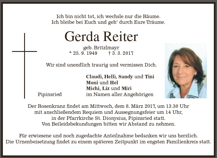 Gottesdienst am Mittwoch, dem 8. März 2017, um 14:00 Uhr in St. Dionysius mit anschließender Aussegnung in Pipinsried.
