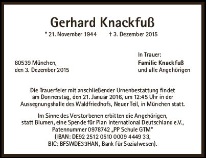 Wir trauern um Herrn Gerhard Knackfuß Kaufmann * 21.11.1944 † 03.12.2015 |
