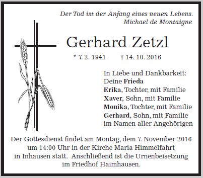 Gottesdienst am Montag, dem 7. November 2016, um 14:00 Uhr in Maria Himmelfahrt in Inhausen anschließend Urnenbeisetzung im Friedhof Haimhausen