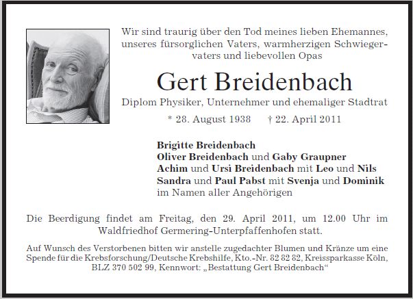Beerdigung am Freitag, dem 29. April 2011, um 12:00 Uhr im Waldfriedhof Germering-Unterpfaffenhofen.