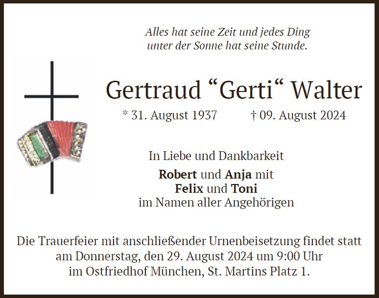 Trauerfeier und anschließende Urnenbeisetzung am Donnerstag, den 29. August 2024 um 09:00 Uhr im Münchener Ostfriedhof, St. Martins Platz 1 |