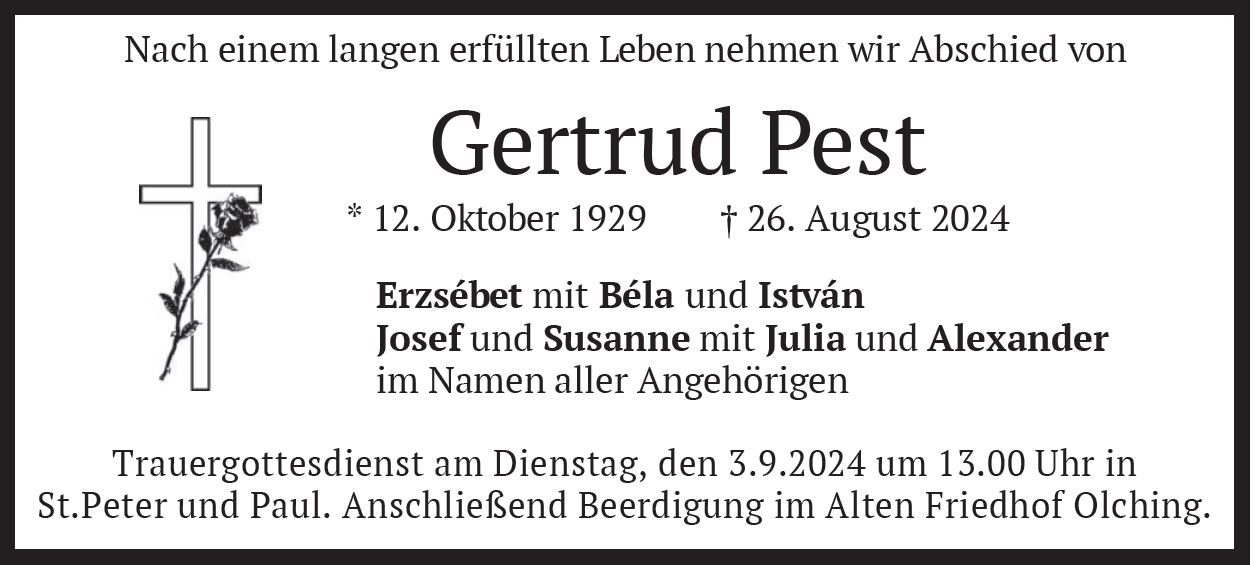 Trauergottesdienst am Dienstag, den 3.9.2024 um 13.00 Uhr in St.Peter und Paul. Anschließend Beerdigung im Alten Friedhof Olching. |