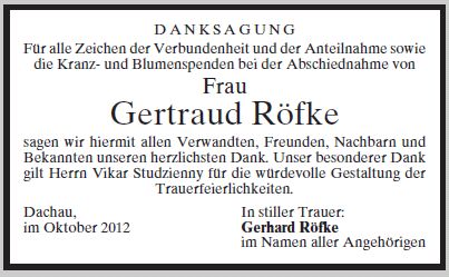 Trauerfeier am Donnerstag, dem 4. Oktober 2012, um 10:00 Uhr im Hanrieder BestattungshausBestattungshaus Beerdigung am Donnerstag, dem 4. Oktober 2012, um 11:00 Uhr im Dachau Waldfriedhof