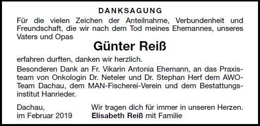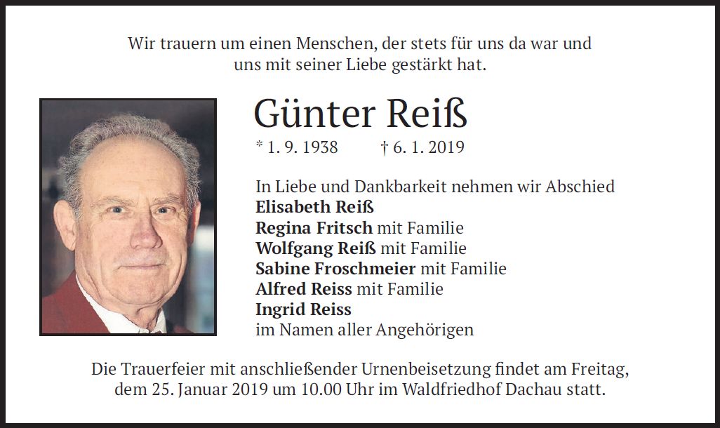 Die Trauerfeier mit anschließender Urnenbeisetzung findet am Freitag, den 25.1.2019 um 10.00 Uhr am Waldfriedhof Dachau statt.