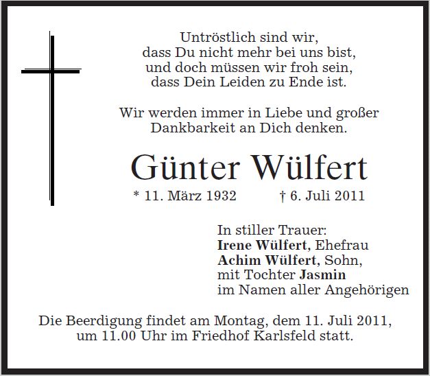 Die Trauerfeier mit anschließender Beerdigung findet statt am Montag,dem 11. Juli 2011, um 11:00 Uhr im Friedhof Karlsfeld.