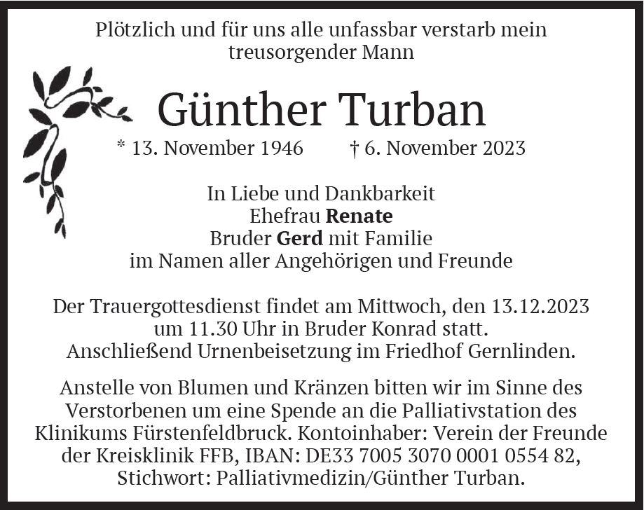 Der Trauergottesdienst findet am Mittwoch, den 13.12.2023 um 11.30 Uhr in Bruder Konrad statt. Anschließend Urnenbeisetzung im Friedhof Gernlinden. Anstelle von Blumen und Kränzen bitten wir im Sinne des Verstorbenen um eine Spende an die Palliativstation des
