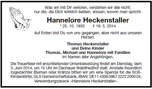 Wir trauern um Frau Hannelore Heckenstaller geb. Erdmann Hausfrau * 25.10.1935 † 19.05.2014 |